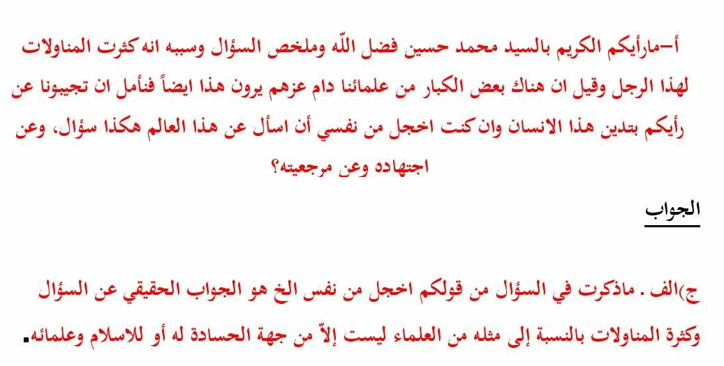 س: ما رأيكم الكريم بالسيد محمد حسين فضل الله وملخص السؤال وسببه انه كثرت المناولات لهذا الرجل وقيل ان هناك بعض الكبار من علمائنا دام عزهم يرون هذا ايضاً فنأمل ان تجيبونا عن رأيكم بتدين هذا الانسان وان كنت اخجل من نفسي أن اسأل عن هذا العالم هكذا سؤال، وعن اجتهاده وعن مرجعيته ؟
