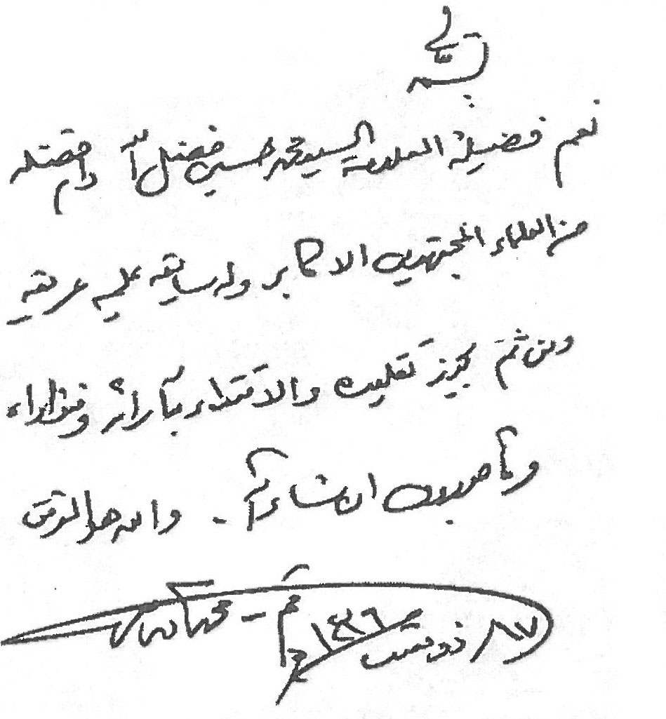 ج: «نعم، فضيلة العلامة السيّد محمد حسين فضل الله (دام فضله) من العلماء المجتهدين الأكابر، وله سابقة علميّة عريقة، ومن ثَمّ يجوز تقليده والاقتداء بآرائه وفتاويه، ومأجورون، إن شاء الله. والله هو الموفّق».