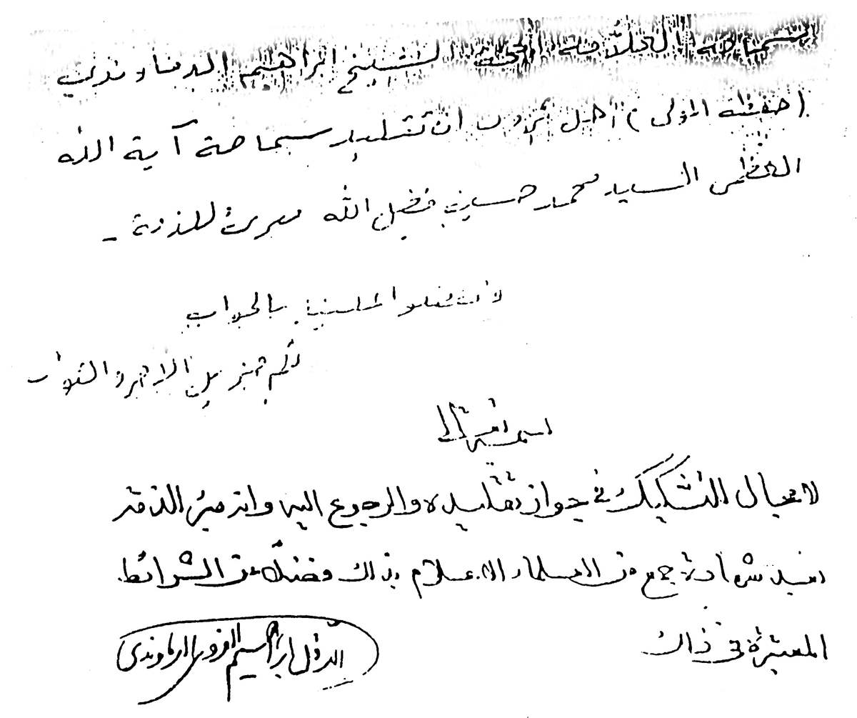 ج: «لا مجال للتّشكيك في جواز تقليده والرّجوع إليه، وإنّه مبرئ الذمّة بعد شهادة جمعٍ من العلماء الأعلام بذلك، فضلاً عن الشّرائط المعتبرة في ذلك».