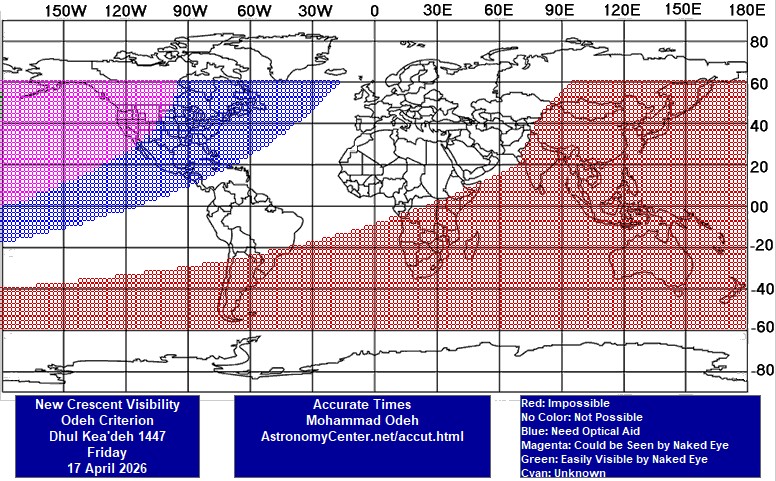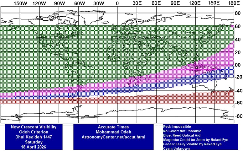 As noted in the above-mentioned image, sighting the new crescent (the crescent of Zoul-Qi'da) on Friday evening (the night of Saturday) is possible in regions with which we share a part of the night. Sighting is possible with the naked eye, subject to clear skies and observer expertise, in areas such as the northwestern part of North America. Sighting is also possible with the armed eye in vast regions of Central and North America.