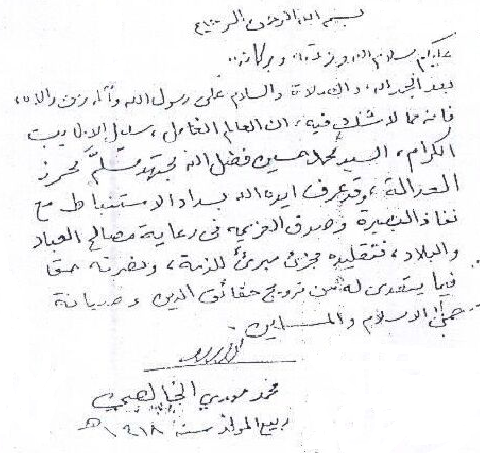 أجاب: «...فإنه مما لا شك فيه، إن العالم العامل سليل الأطياب الكرام، السيد محمد حسين فضل الله مجتهد مسلم محرز العدالة، وقد أيده الله بسداد الاستنباط مع نفاذ البصيرة وصدق العزيمة في رعاية مصالح العباد والبلاد، فتقليده مجزىء مبرىء للذمة، ونصرته حق فيما يتصدى له من ترويج حقائق الدين وصيانة حمى الإسلام والمسلمين».